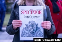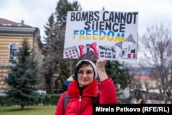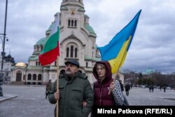 "Всички сме тук да подкрепим усилието на Украйна да продължи да се бори за свободата си и да почетем изключителната доблест и смелост на целия украински народ да отстоява четири години", каза пред Свободна Европа Ива Данова, която е сред събралите се пред "Света София".